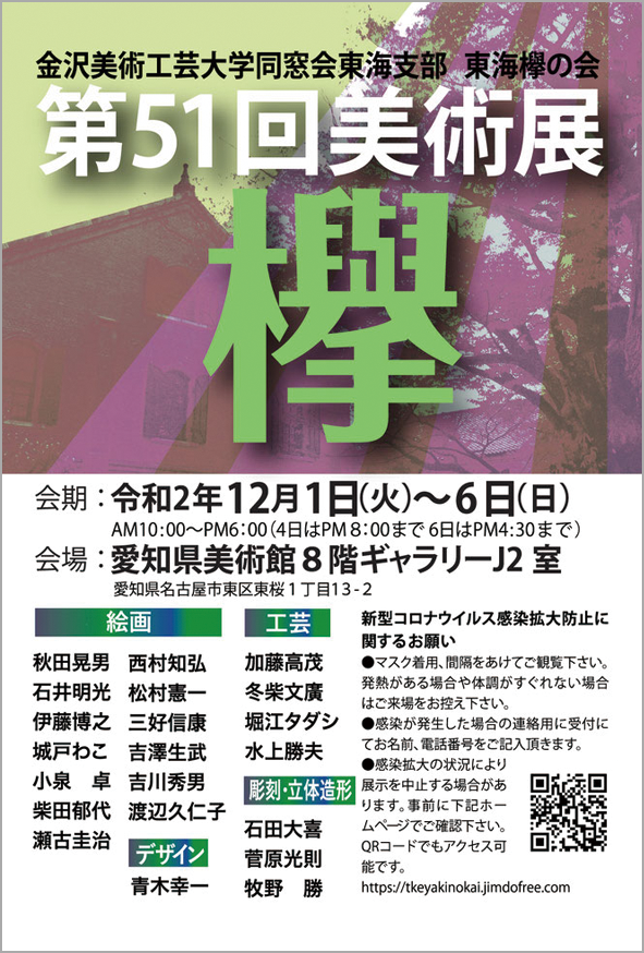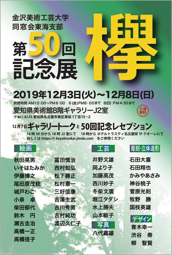 2019年12月3日(火)~8日(日) 記念すべき50回目の展覧会!金沢美術工芸大学の卒業生で、この東海地区に在住の同窓生の展覧会が開催されました。アート系・デザイン系ですが、社会人となり皆独自の作品で頑張っています。また、12月7日はギャラリートークや記念レセプションも開催しました。ぜひお出かけください。そして気軽に声かけてください。 50周年記念展は美術展に出品出来なかった仲間たち含め3回目の図録集を発刊しました。 |