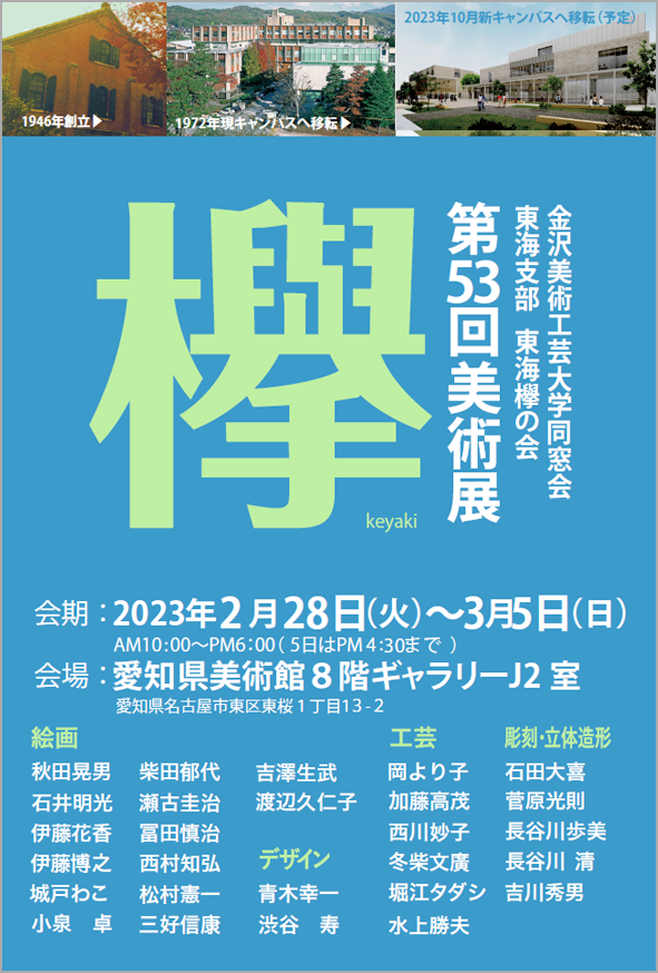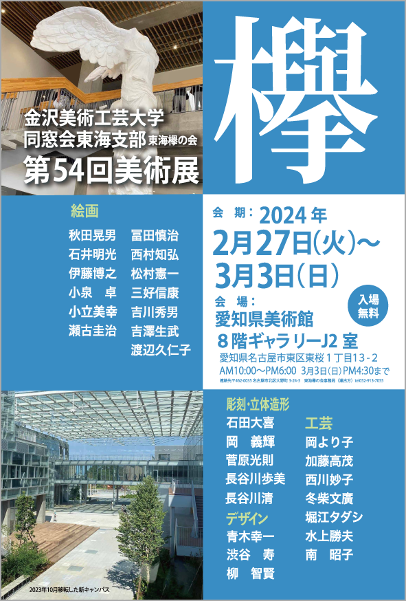 2024年2月27日(火)~3月3日(日) 母校金沢美大の旧キャンパスは、築40年を経過したことによる老朽化が著しく2023年10月金沢大学工学部跡地へ移転されました。東海の地での第54回美術展欅は旧校舎で学んだ感謝と新キャンパス竣工お祝いの意を込めての展示となります。久しぶりに参加されたり新メンバーも出展しました。 この度、能登半島地震で被災された皆様には心よりお見舞い申し上げます。 |