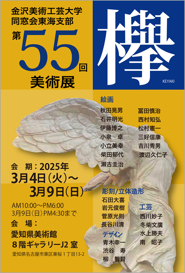 2025年3月4日(火)~9日(日) 美術展欅は2025年3月に55回となりました。これまで5回ごとに印刷媒体による作品集を3回発行してきましたが、今回からWEB形式に変更しました。東海地方在住の金沢美大同窓生の誰もが出品でき世界中の誰もが閲覧できるようになりました。掲載作品をお楽しみください。 |